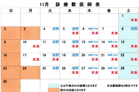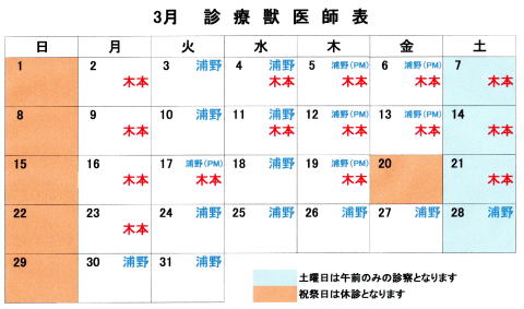 各曜日の獣医師勤務表は下記の通りとなります。 |