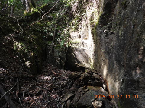 郷土史と言っても古そうだったので、それから崩れたのかなあ、って思っていると、下の方から大きな声が聞こえてきました。さっきのじっちゃんが、気になってわざわざ来てくれたらしいです。「向こうに穴の痕跡はあったけど埋まってました」、っていうと、そういえば、隣の谷にもあったんとちゃうかなあ、っておっしゃいます。確かに、そちら方面を見ると雰囲気がありました。