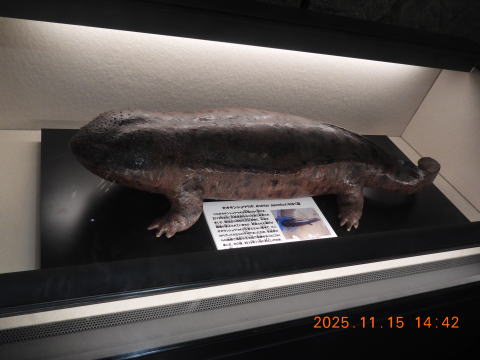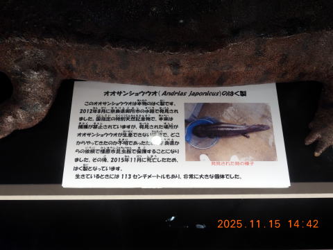 入ってすぐに、オオサンショウウオの剥製がありました。保護個体だそうですが、ここは自然分布の場所ではないので誰かが飼育放棄した個体らしいです。剥製は太り過ぎであまり出来がよくないように思いました。