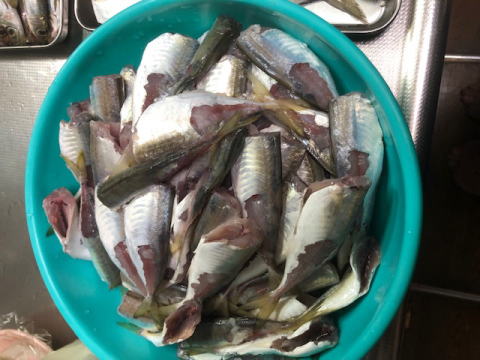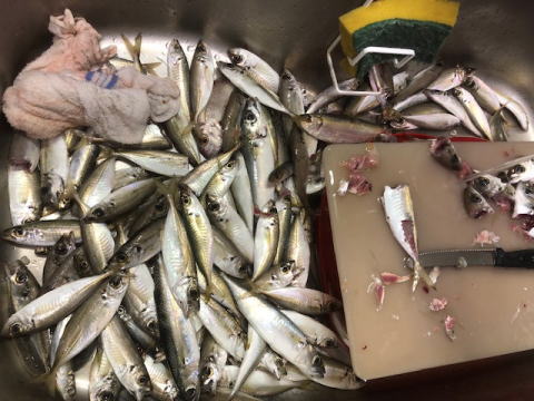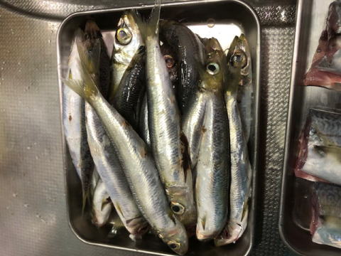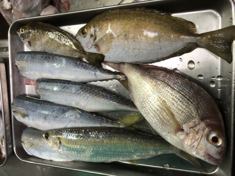(左)アイゴ2匹、サッパにタイ、サバいくつか。