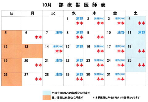 各曜日の獣医師勤務表は下記の通りとなります。 |